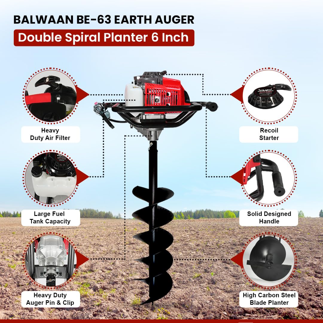 बलवान कृषि BE-63 अर्थ ऑगर 63 cc 2 स्ट्रोक शक्तिशाली हैवी ड्यूटी पेट्रोल इंजन 6 इंच डबल स्पाइरल प्लांटर के साथ गड्ढे खोदने, वृक्षारोपण और बाड़ लगाने के उद्देश्य के लिए उपयुक्त