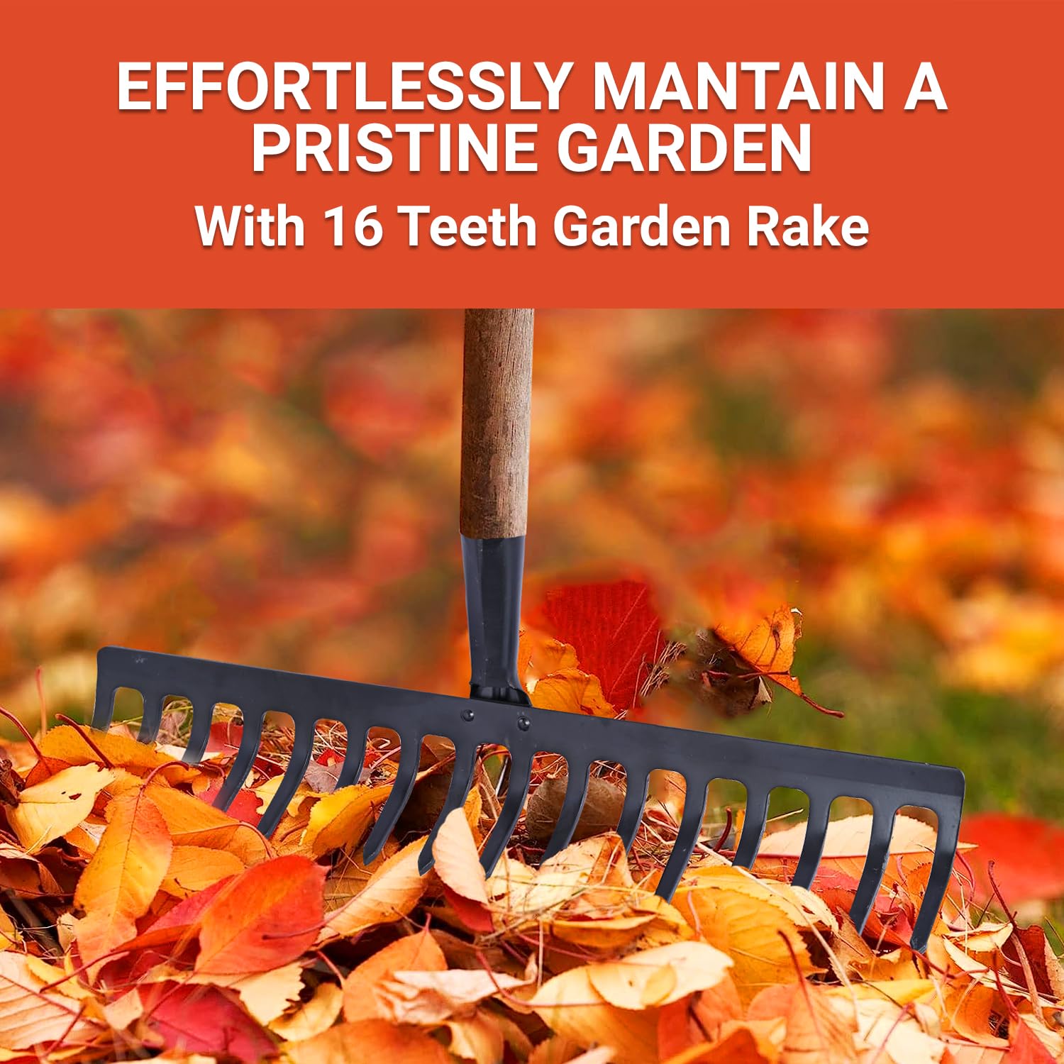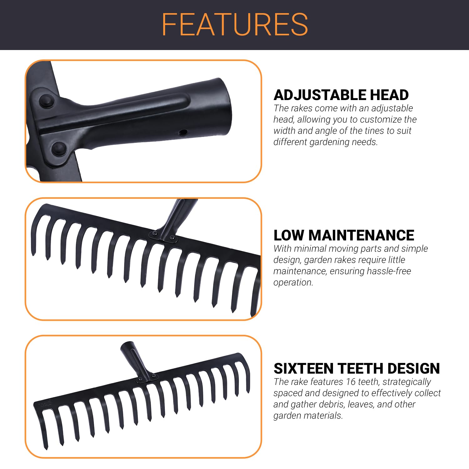 - 16-दांतों वाला डिज़ाइन: 16 मज़बूत और टिकाऊ दांतों के साथ, यह गार्डन रेक पत्तियों, मलबे और अन्य बगीचे की सामग्री को कुशलतापूर्वक इकट्ठा करता है। समान रूप से फैले हुए दांत प्रभावी रेकिंग की अनुमति देते हैं और क्षेत्र की पूरी तरह से कवरेज सुनिश्चित करते हैं।