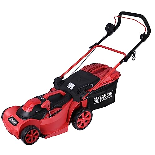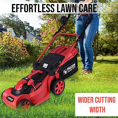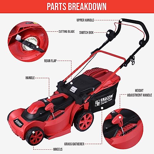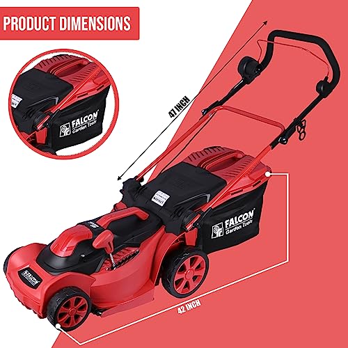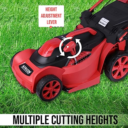 फाल्कन रोटो ड्राइव-330 1400W 14" इलेक्ट्रिक रोटरी लॉन घास काटने की मशीन 3500 RPM घास काटने की मशीन 35L कैचर बॉक्स और 300 वर्ग मीटर तक गार्डन यार्ड फार्म को बनाए रखने के लिए 7 समायोज्य ऊंचाई के साथ
