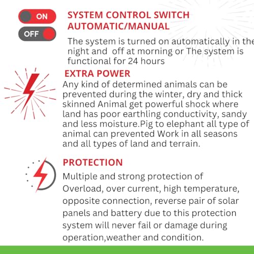 - फसल सुरक्षा के लिए सबसे शक्तिशाली, सस्ती, आधुनिक और 100% विश्वसनीय ज़टका सिस्टम सभी प्रकार की फसलों, पौधों या बागवानी को सभी प्रकार के जानवरों, सूअरों से लेकर हाथियों तक से 100% सुरक्षित रखा जा सकता है, और किसी भी तरह के आदतन जानवरों को भी दूर रखा जा सकता है। यह इलेक्ट्रिक झटका मशीन एक छोटा, तेज और दर्दनाक सुरक्षित झटका देती है और एक सुरक्षित खेत के लिए सभी आवश्यक अलार्म प्रदान करती है।