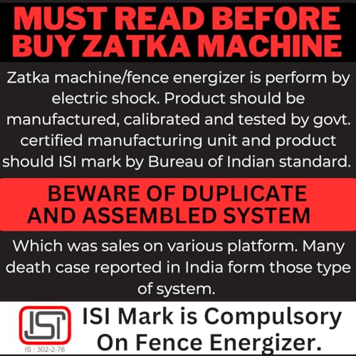 - आईएसआई मार्क वाली बीआईएस स्वीकृत झटका मशीन दुनिया की पहली और एकमात्र सौर बाड़ झटका प्रणाली है जो आईएसआई मार्क के साथ सरकार द्वारा दी गई बाड़ एनर्जाइज़र की सुरक्षा, गुणवत्ता और स्थायित्व का आश्वासन प्रदान करेगी। भारत की। दुनिया की नंबर 1 राष्ट्रीय और अंतरराष्ट्रीय मानक गुणवत्ता का अनुपालन करती है।