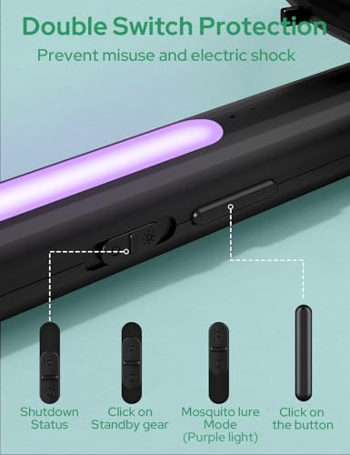 - 【2-इन-1 डुअल मोड मच्छर मारने वाला】: बग जैपर रैकेट के उपयोग के दो तरीके हैं। हाथ से पकड़े जाने वाला मोबाइल फ्लाई स्वैटर आपको मच्छरों को सटीक रूप से मारने में मदद करता है। मच्छर मारने वाले को बैंगनी रोशनी वाले मच्छर मारने वाले में मोड़ने के लिए हैंडल को घुमाएँ, जिससे आपके हाथ टेबल पर आराम करने के लिए खाली हो जाएँ या इसे सीधे दीवार पर लटका दें। कृपया ध्यान दें: इलेक्ट्रिक मच्छर मारने वाले की रोशनी सामान्य मच्छर मारने वाले मोड में नहीं जलेगी।