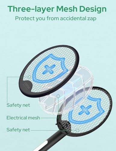 - 【पूर्ण सुरक्षा डिज़ाइन】: तीन-परत इन्सुलेशन बाहरी जाल डिज़ाइन से लैस, भले ही आपकी हथेली जाल की सतह को छू ले, आपको बिजली का झटका नहीं लगेगा। इसके अलावा, इस इलेक्ट्रिक मच्छर स्वैटर में एक सुरक्षा लॉक डिज़ाइन भी है, जिसे उपयोग शुरू करने से पहले खोलना होगा। यह डिज़ाइन बच्चों द्वारा गलती से इसे छूने के जोखिम को बहुत कम कर सकता है।