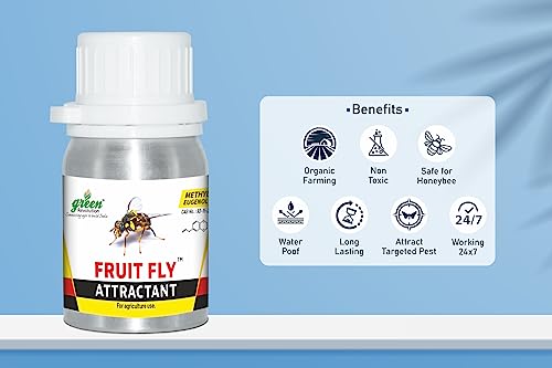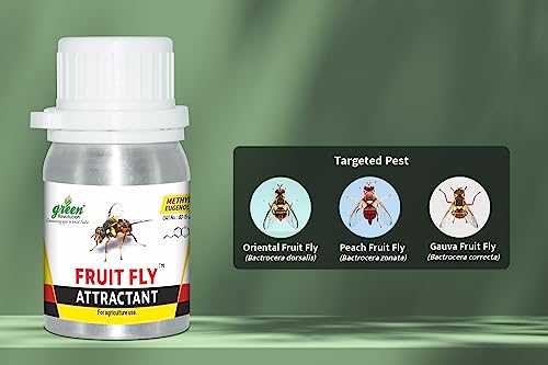 - हरित क्रांति के फल मक्खी जाल आकर्षक (मिथाइल यूजेनॉल) का परिचय - प्राकृतिक, शक्तिशाली लालच जो केवल बैक्ट्रोसेरा डोर्सलिस (फल मक्खियों) को आकर्षित करता है और फंसाता है, जिससे आपकी कीमती फसल बच जाती है!