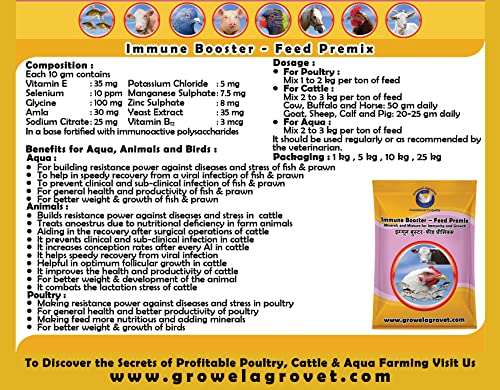 - मवेशियों के लिए लाभ: प्रतिरक्षा बूस्टर प्रीमिक्स पशु के बेहतर वजन और विकास में सहायता करता है। यह मवेशियों के दुद्ध निकालना तनाव का मुकाबला करता है।