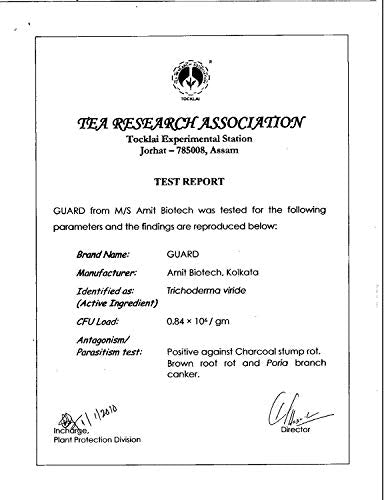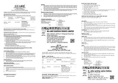 विवरण: ट्राइकोडर्मा विराइड को उड़द की फसल में जड़ सड़न (मैक्रोफोमिना फेजोलिना) के नियंत्रण के लिए पंजीकृत किया गया है। रोकथाम के तौर पर 4 ग्राम प्रति किलोग्राम बीज का प्रयोग करें। 10 ग्राम प्रति लीटर पानी का उपयोग करें, मुरझाने वाले पौधों के चारों ओर की मिट्टी को गीला करें। गार्ड (ट्राइकोडर्मा विरिडे) का उपयोग कैसे करें: बैंगन, आलू, मिर्च, टमाटर, खीरे, कटे हुए और गमले के फूल, बाग, अंगूर के बाग, ग्रीनहाउस, लॉन और नर्सरी में सजावटी पौधे आदि। लक्ष्य कीट और रोग: पाइथियम एसपीपी, गैनोडर्मा एसपीपी, राइजोक्टोनिया सोलानी, फ्यूसेरियम एसपीपी, बोट्रीटीस सिनेरिया, स्क्लेरोटियम एसपीपी, स्क्लेरोटिनिया एसपीपी। और यूस्टिलोगो एसपीपी, आदि। इसका उपयोग जड़ सड़न, डैम्पिंग ऑफ, विल्ट आदि को नियंत्रित करने के लिए किया जाता है। आवेदन की विधि: समान अनुप्रयोग प्राप्त करने के लिए ट्राइकोडर्मा विराइड को पर्याप्त पानी (5 ग्राम/लीटर) में डालें। ग्रीनहाउस पॉटिंग मिश्रण, मिट्टी या रोपण क्यारियों में 100-200 ग्राम प्रति घन मीटर (ढीला) की दर से लगाएं। ट्राइकोडर्मा विराइड को फिल्टर से छानने के बाद कम दबाव वाले पानी वाले नोजल जैसे पंखे के नोजल या अन्य पानी देने वाले सिस्टम (ड्रिप सिस्टम) के माध्यम से लगाया जा सकता है। निलंबन बरकरार रखने के लिए आंदोलन करें। सर्वोत्तम प्रभाव के लिए, बीजारोपण या रोपाई के लिए उपयोग से कई दिन पहले पॉटिंग मिश्रण का उपचार करें। बल्बों और सजावटी पौधों के लिए: रोपण से पहले ट्राइकोडर्मा विराइड सस्पेंशन (100 ग्राम/लीटर) में बल्बों को डुबोएं। आवेदन की आवृत्ति: सब्जियों के सजावटी पौधों में दो से तीन अनुप्रयोगों और लॉन और लैंडस्केप फसलों में 4-5 अनुप्रयोगों की सिफारिश की जाती है। पौधे के विकास के शुरुआती चरणों के दौरान अनुप्रयोग विकास के महत्वपूर्ण चरणों के दौरान पौधे की रक्षा करते हैं। खुराक: मिट्टी में प्रयोग: 5 किग्रा/हेक्टेयर किसी भी जैविक उर्वरक के साथ (रोगजनक संदूषकों के बिना)। बीज उपचार: मानक गीले उपचार के अनुसार 4-5 ग्राम प्रति किलोग्राम बीज की दर से। अंकुर उपचार: रोपण से पहले 100 ग्राम/लीटर की दर से।