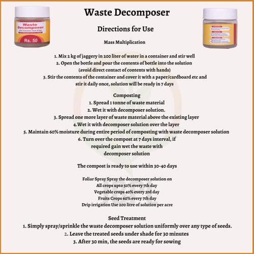 - ✅उपयोग में आसान: जेबीपीएल वेस्ट डीकंपोजर को उपयोगकर्ता की सुविधा के लिए डिजाइन किया गया है। बस अपने जैविक कचरे में डीकंपोजर की आवश्यक मात्रा डालें, इसे अच्छी तरह मिलाएं और बाकी प्रकृति को करने दें। इसे उपयोगकर्ता के अनुकूल समाधान बनाने के लिए किसी जटिल सेटअप या अतिरिक्त उपकरण की आवश्यकता नहीं होती है।