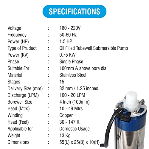 - 1.5 एचपी सिंगल फेज, 15 स्टेज सबमर्सिबल पंप