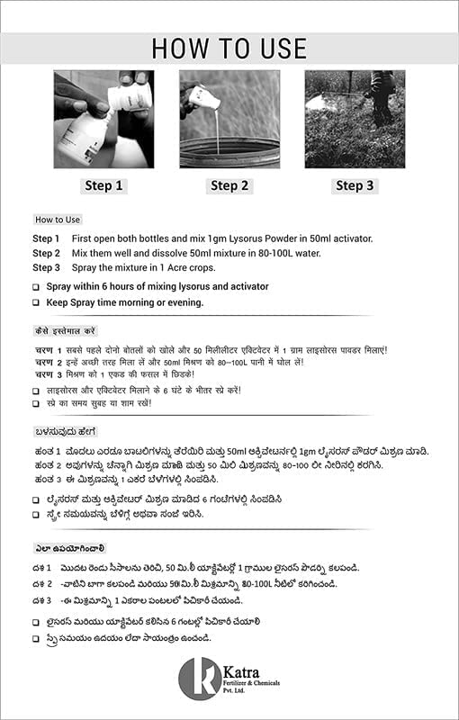 - लगाने की विधि - सबसे पहले 1 ग्राम लाइसोरस पाउडर को पानी में घोलें और फिर 50 मिली एक्टिवेटर को 100 लीटर पानी में मिलाकर 1 एकड़ की फसल पर छिड़काव करें। अनुशंसित परिवर्धन- पौधे के विकास और विकास चरणों के दौरान और जीवाणु और वायरल संक्रमण की उपस्थिति पर 2 से 3 बार।