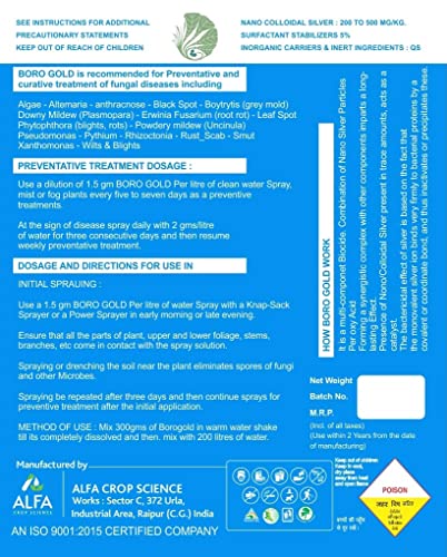 - तकनीकी सूत्र: कोलाइडल सिल्वर नैनो प्रौद्योगिकी। बागवानी और कृषि प्रयोजन के लिए उपयोग किया जा सकता है। केवल फंगल और बैक्टीरियल रोगों के लिए उपयोग करें।
