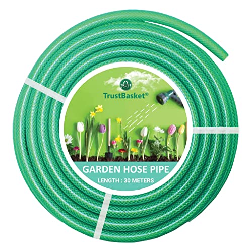 ट्रस्टबास्केट हेवी ड्यूटी अत्यधिक टिकाऊ पीवीसी प्लेन ग्रीन ब्रेडेड वॉटर होज़ पाइप (30 मीटर) वॉटर टैप एडाप्टर और 2 क्लैंप के साथ - होम गार्डनिंग, लॉन, कार वॉश, पालतू स्नान के लिए कनेक्ट करना आसान।
