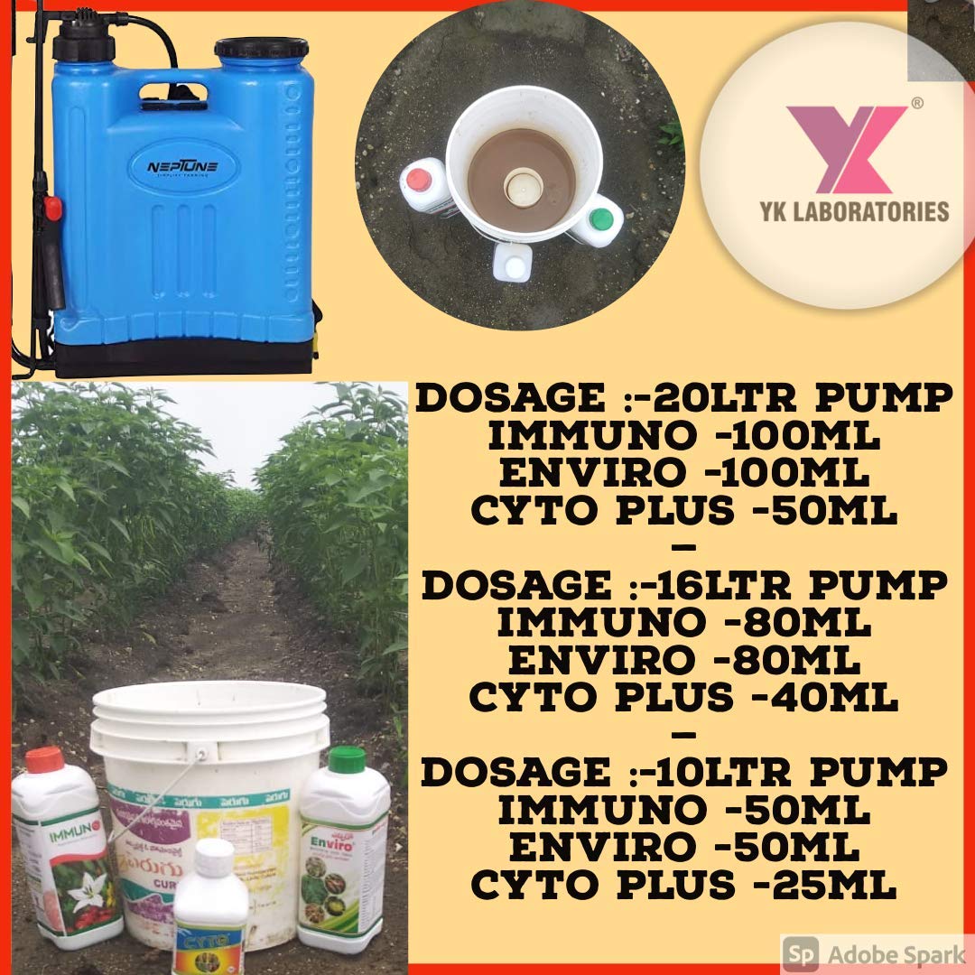 खुराक: इम्यूनो + एनवायरो + साइटो प्लस - 5 एमएल+5एमएल+3एमएल/लीटर पानी।