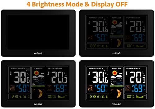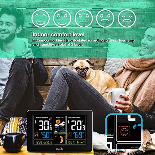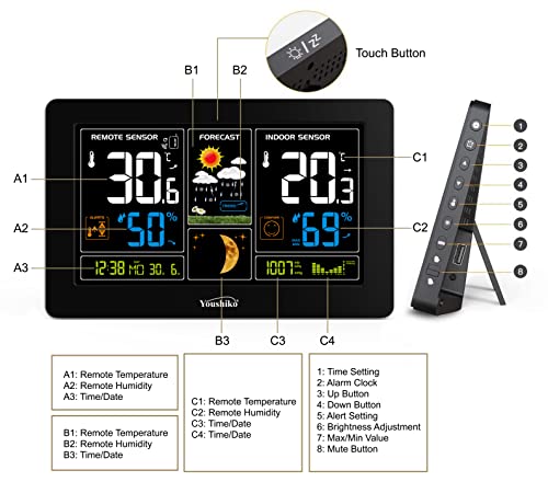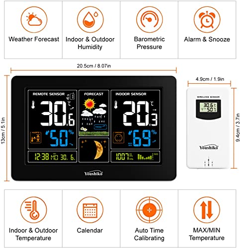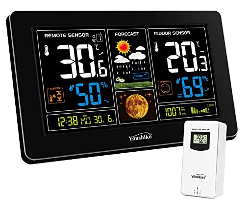 Youshiko YC9444 (आधिकारिक 2023 यूके संस्करण) वायरलेस मौसम स्टेशन, रेडियो नियंत्रित घड़ी, इनडोर आउटडोर तापमान थर्मामीटर, आर्द्रता, बैरोमीटर का दबाव, बर्फ चेतावनी, चंद्रमा चरण