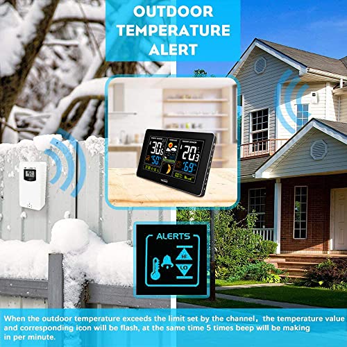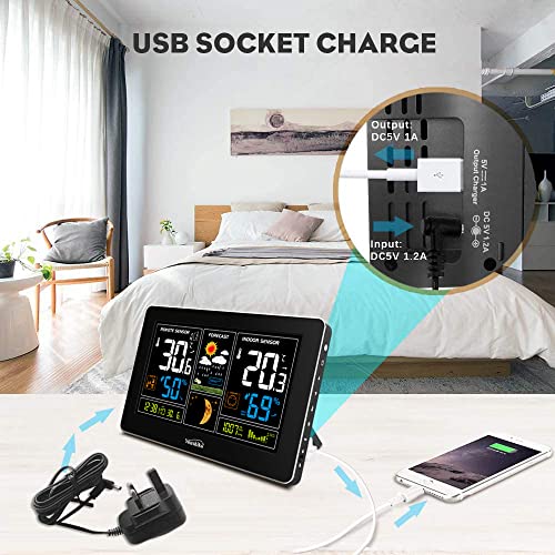 - नवीनतम 2023 यूके संस्करण, यूके आधारित कंपनी द्वारा यूके वारंटी और बिक्री के बाद समर्थन के साथ पेश किया गया, मौसम की प्रवृत्ति के प्रदर्शन के साथ मौसम का पूर्वानुमान (एनीमेशन के साथ), समय और मौसम की जानकारी के लिए बहु-रंग अनुभाग प्रदर्शन, बड़ा अंक और आउटडोर तापमान (° C / ° F) और आर्द्रता रीडिंग, इनडोर आराम स्तर, आउटडोर तापमान चेतावनी, आपके फोन या आईपैड आदि को चार्ज करने के लिए यूएसबी पोर्ट।
