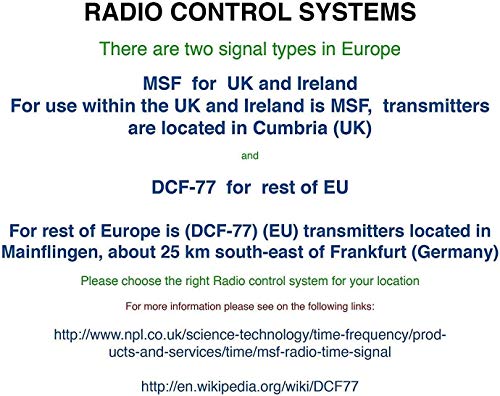 - रेडियो नियंत्रित घड़ी (एमएसएफ - यूके संस्करण और आयरलैंड), वसंत और शरद ऋतु के लिए स्वचालित समय परिवर्तन और स्वचालित समय जांच। कैलेंडर और कार्यदिवस के साथ 12/24 घंटे का समय प्रदर्शन।