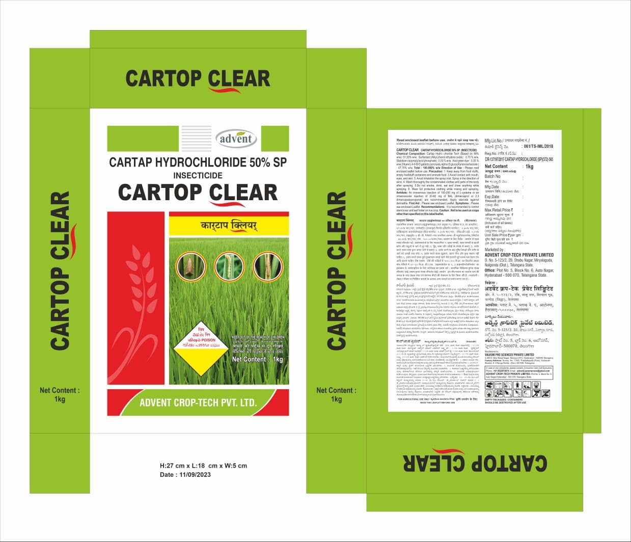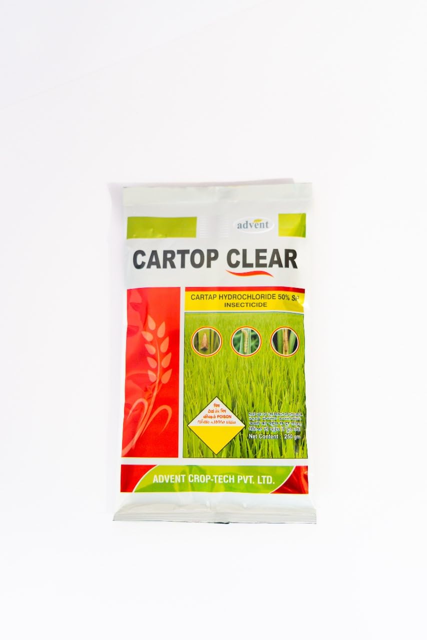 ऑफर केलेली उत्पादने विविध प्रकारच्या सेंद्रिय आणि कृत्रिम रसायनांचा वापर करून तयार केली जातात, तसेच अनेक प्रकारच्या बुरशी आणि कीटकांना सामोरे जाण्यासाठी विविध प्रभावी संयुगे यांचे मिश्रण केले जाते, याचा अर्थ त्यातील बहुतेक उत्पादने इतर कीटकनाशके किंवा कमी करणारे घटक यांच्या संयोगाने सुरक्षितपणे वापरली जाऊ शकतात. शिवाय, जेव्हा वातावरणात किंवा अन्न पिकांवर वापरले जाते तेव्हा उत्पादने मानव किंवा प्राण्यांच्या आरोग्यास धोका देत नाहीत. तथापि, इच्छेनुसार सुरक्षितता आणि परिणामकारकता प्राप्त करण्यासाठी उत्पादने वापरताना योग्य हाताळणी आणि साठवण उपाय योजले पाहिजेत. Cartop Clear (Cartap Hydrochloride 50% SP) हे Nereistoxin analogue गटाचे कीटकनाशक आहे, जे कीटकांवर प्रभावी नियंत्रण देते.