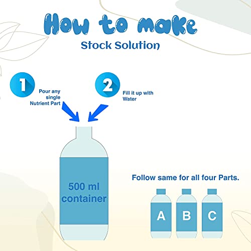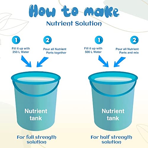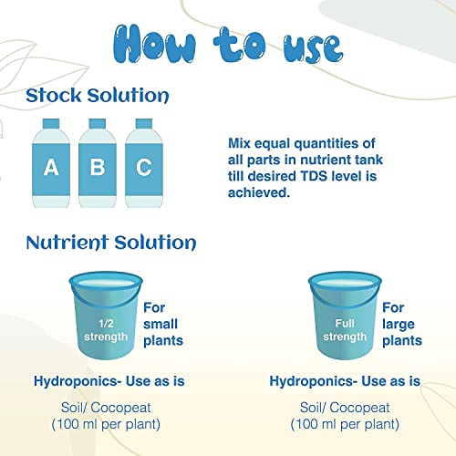 - * कसे तयार करावे - मोठ्या झाडांसाठी हे पाण्यात विरघळणारे पोषक तत्व आहेत पूर्ण शक्ती - 250 लिटर पाणी हायड्रोपोनिक्समध्ये वापरल्यास सर्व A, B आणि C भाग चांगले मिसळा, परंतु कोकोपीट आणि माती बागकामासाठी 100 मिली प्रति झाड वापरा. अर्धी ताकद - 500 लिटर पाण्यात लहान झाडांसाठी सर्व A,B आणि C भाग टाका जर हायड्रोपोनिक्स वापरत असेल तर माती आणि कोकोपीटमध्ये 100 मिली प्रति झाड घाला.