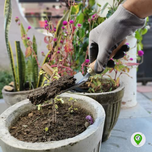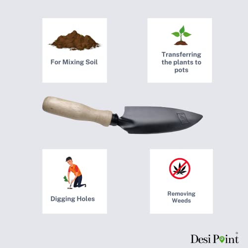 तपशील: *देसी पॉइंट बागकामाची साधने व्यावसायिकांनी बनवली आहेत. हे पूर्णपणे व्यावसायिक लोहारांच्या हाताने बनवलेले आहे. ही लोखंडी खुरपी पॉट सॉईल गार्डनिंग, बागेतील माती खोदण्यासाठी आदर्श आहे. हे दीर्घकाळ टिकणारे, वापरण्यास सोपे आहे आणि चांगली पकड यासाठी त्याला लाकडी हँडल आहे. *ट्रॉवेल हे एक हाताचे साधन आहे जे खोदण्यासाठी, लावण्यासाठी, गुळगुळीत करण्यासाठी किंवा थोड्या प्रमाणात चिकट किंवा कणिक सामग्री हलविण्यासाठी वापरले जाते. हे रोपे लावण्यासाठी, नको असलेले तण काढण्यासाठी आणि खतांमध्ये मिसळण्यासाठी देखील वापरले जाऊ शकते.