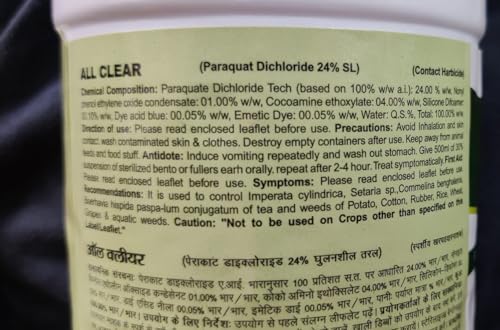 - ऑल क्लीअर हे ब्रॉड स्पेक्ट्रम, नॉन-सिलेक्टिव्ह आणि कॉन्टॅक्ट हर्बिसाइड आहे ज्यामध्ये 24% पॅराक्वॅट डायक्लोराईड एआय आहे जे ब्रॉडलीव्ह तण आणि गवत प्रभावीपणे नियंत्रित करते.