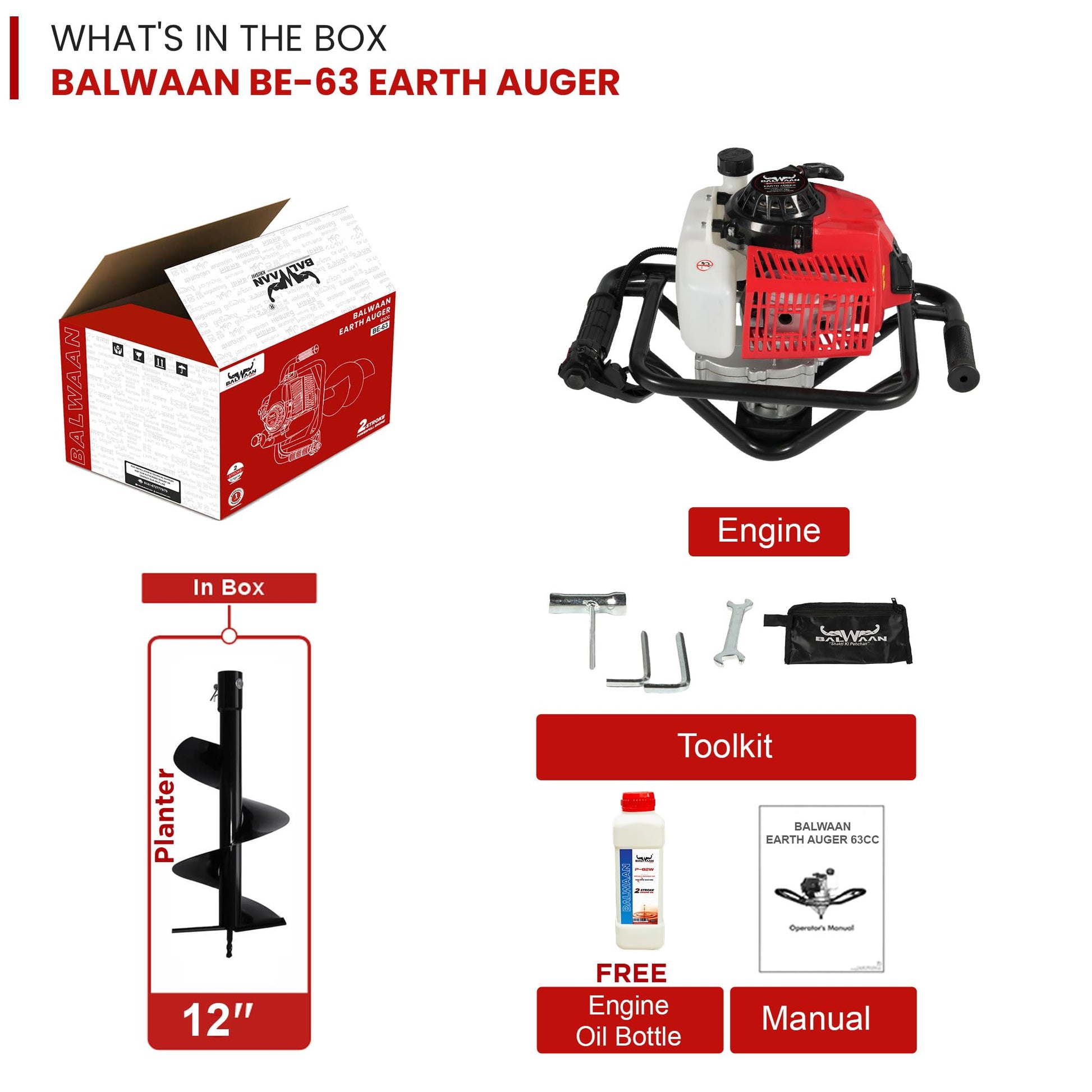 Balwaan BE-63 Earth Auger 63 cc Powerful Heavy Duty Engine with Planter Suitable for Digging Holes Plantation & Fencing Purpose (12 Inch Single Sprial Planter)