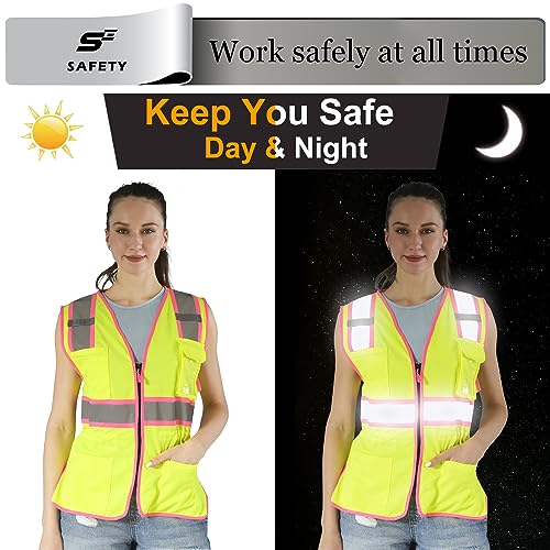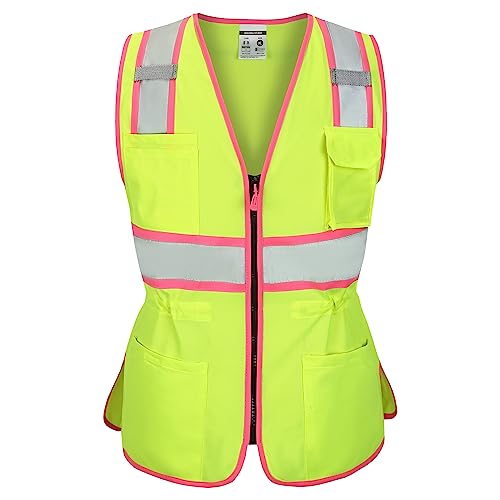 Hi Vis Safety Vest for Women, Working Drawstring waist Construction Vest with Pockets and Zipper, Womens Safety Vest, ANSI Type R Class2, Yellow Pink Strips, XL, Yellow, X-Large