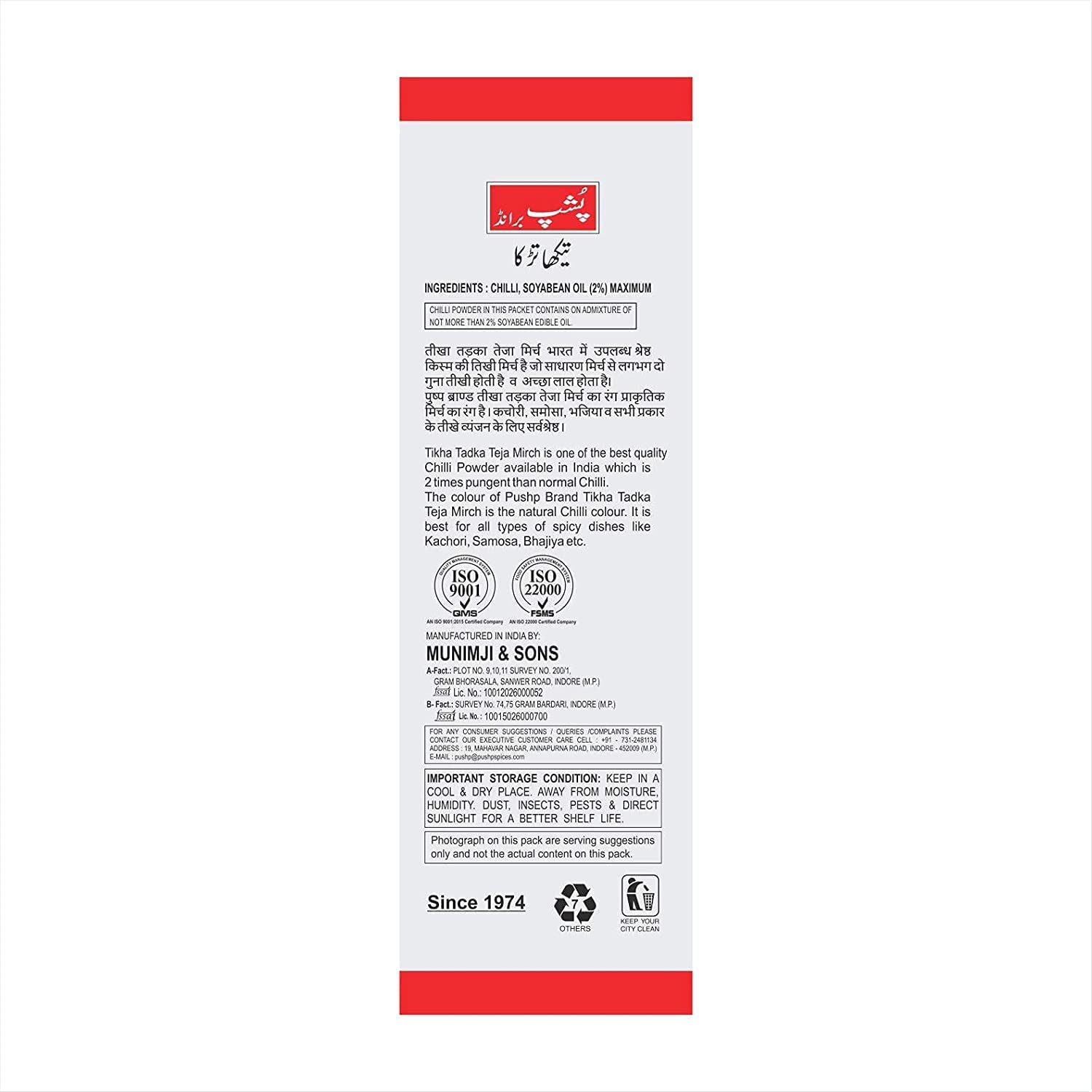 Details: Tikha Tadka Teja Mirch, simply put, is among the spiciest chilli powders to leave our plant on a regular basis. The dish that comes out of the kitchen will be a generic red, but the pungent aroma more than makes up for it. To put it in a nutshell, this is a pretty spicy blend. The colour of this chilli is purely natural, with not a single shred of anything artificial at all. Pushp Tikha Tadka Teja Mirch makes your everyday Dal and Sabzi both tasty and pleasantly spicy at the same time. A little bit of spice is something that everybody likes once in a while, and Pushp Tikha Tadka makes that possible in the healthiest way.